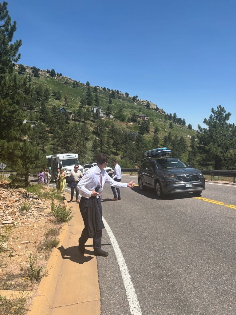 “Yeah, that wasn’t part of the plan,” Macy laughs, now able - weeks later - to fully enjoy the absurdity of it. “I’ll be honest, I didn’t know much about it until after the ceremony and dinner. I don’t know how we got so lucky, but we had a lot of caring and competent people on that bus, and the folks who got stranded were just… very chill about the whole thing. Between sending cars down, somehow getting a couple of Ubers to work, and - this still blows my mind - some truly successful hitchhiking, everyone made it up to the wedding. And they all seemed in a good mood about it. Just amazing. We have really lovely friends to have rolled with that.”